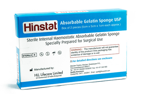 HINSTAT is a sterile Gelatin based haemostatic sponge prepared especially for surgical use. HINSTAT is white, pliable, light and insoluble in water. It is capable of absorbing more than thirty times its weight of well agitated citrated whole blood or approximately forty times its weight of water. The prototype of the product has been developed, pre-clinical studies and bio-compatibility studies have been completed successfully.